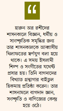 হারুন অর রশীদ ছিলেন পঞ্চম আব্বাসীয় খলিফা। ৭৮৬ থেকে ৮০৯ সালের মধ্যবর্তী সময়কে স্বর্ণযুগ বলা হয়। তিনি যেমন ছিলেন সমরকৌশলী তেমনি প্রজারঞ্জক শাসকও। প্রশস্ত রাজপথের পাশে পরিকল্পিতভাবে গড়ে ওঠা অসংখ্যা অট্টালিকা, শিক্ষা প্রতিষ্ঠান, আদালত, দোকানপাট, খেলার মাঠ ছিল। তার উল্লেখযোগ্য অবদান হলো ব্যবসা-বাণিজ্যের উন্নতি, গরিব-দুঃখীদের জন্য সরাইখানা চালু করা, যোগাযোগ ব্যবস্থার উন্নয়ন সাধন, চিকিৎসা ব্যবস্থার উন্নয়ন ও নতুন নতুন মসজিদ-মাদ্রাসা প্রতিষ্ঠা করা। তার সময়ে নৌযোগাযোগ উন্নত হওয়ার কারণে সুদূর ইউরোপের সঙ্গে আব্বাসীয় খিলাফতের বাণিজ্যিক সম্পর্ক স্থাপিত হয়। তার শাসনাধীন এলাকায় ব্যবসায়ীদের জন্য নিরাপত্তার ব্যবস্থা করা হয় এবং ব্যবসায়ীদের বিশেষ সুবিধা প্রধান করা হয়। ফলে ব্যবসা ক্ষেত্রে নানা উন্নয়ন সাধিত হয়। তার আমলে অন্যতম একটি আমূল পরিবর্তনকারী ঘটনা হলো ‘আল বিমারিস্তান’ নামক চিকিৎসালয় স্থাপন। এটি ছিল বৃহৎ আকারের একটি চিকিৎসালয় যেখানে মুসলিম বিশ্বের নামকরা সব চিকিৎসা বিজ্ঞানী সেখানে সেবা প্রদান ও গবেষণা কাজে নিযুক্ত ছিলেন। তার সময়ে অন্যান্য গুরুত্বপূর্ণ কার্যাবলী হলো আরবদের পানির কষ্ট লাঘব করার জন্য ১০ লাখ দিনার ব্যয়ে নির্মিত ‘নাহরে যুবাইদা’। আবদুল্লাহ বিন ইদ্রিস, শফি, আসমায়ী, আবদুল্লাহ বিন নোয়াস প্রভৃতি জ্ঞানীগুণী ও কবিদের পৃষ্ঠপোষকতা দান এবং ইব্রাহিম মসুলির মতো বিখ্যাত গায়কদের নিজ দরবারে আশ্রয় প্রদান করা।
