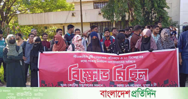 এর আগে সকাল থেকে শীতকালীন ছুটি বাতিল ও দশ তারিখের মধ্যে নির্বাচনের তারিখ পুনঃনির্ধারণের দাবিতে গণস্বাক্ষর কর্মসূচি করেন শিক্ষার্থীরা। এতে অধিকাংশ শিক্ষার্থী কর্মসূচিতে অংশগ্রহণ করেন।