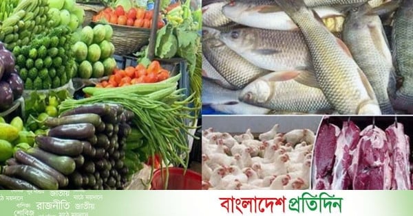 মাছের মধ্যে প্রতিকেজি মাছে বেড়েছে ২০ থেকে ৩০ টাকা। আজ প্রতিকেজি রূপচান্দা বিক্রি হয় ৩৫০-৭০০ টাকা, আইড় ৪০০-৬৫০ টাকা, লইট্যা ও ফাইস্যা ১৫০-২০০ টাকা, পোয়া মাছ ২৫০ থেকে ৩০০ টাকা, শাপলা পাতা মাছ ৩৫০-৪৫০ টাকা, কোরাল ৬০০-৯০০ টাকা, চিংড়ি (বাগদা ও গলদা) আকারভেদে ৬৫০-১২০০ টাকা, ছোট চিংড়ি ৭০০-১২০০ টাকা, রুই ও কাতলা ৩৫০-৪৫০ টাকা, পাবদা ছোট আকারের ৪০০ টাকা, মাঝারি সাইজের ৫০০-৬০০ টাকা, শিং ৪০০-৫০০ টাকা, টেংরা ৬০০-৭০০ টাকা, পুঁটি ২০০-২৫০ টাকা, সরপুঁটি ৩০০-৪৫০ টাকা, তেলাপিয়া ২৫০-৩০০ টাকা, নাইলোটিকা ২২০-২৮০ টাকা, কৈ মাছ ২০০-২২০ টাকা, পাঙ্গাস, সিলভার কার্প ২৫০ থেকে ২৮০ টাকা। অন্যদিকে, বাজারে মুরগির দাম বেড়েছে ৫-১০ টাকা। আজ সোনালী মুরগি বিক্রি হয় প্রতিকেজি ৩৫০ টাকা ও ব্রয়লার মুরগি বিক্রি হচ্ছে ১৬০-১৭০ টাকা, পাকিস্তানি কক ৩৪০ থেকে ৩৫০ টাকা, দেশি মোরগ ৬৫০ টাকা, জাতভেদে প্রতি পিস হাঁস বিক্রি হচ্ছে ৬০০ থেকে ৭০০ টাকা, গরুর মাংস ৭৫০ থেকে ৯৫০ টাকা, খাসি ও পাঁঠা ছাগলের মাংস ১২০০ থেকে ১২৫০ টাকায় বিক্রি হচ্ছে। ফার্মের মুরগির ডিম প্রতি ডজন ১৩০ থেকে ১৩৫ টাকা, দেশি মুরগির ডিম ১৮০ টাকা ও হাঁসের ডিম ২৩০ টাকা বিক্রি হচ্ছে।