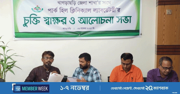 খাগড়াছড়িতে আরণ্যক ভ্যাকসিন হোম ও পার্কহিল ক্লিনিকাল ল্যাবরেটরির মধ্যে স্বাস্থ্যসেবা সম্প্রসারণে একটি চুক্তি স্বাক্ষর উপলক্ষে আলোচনা সভা অনুষ্ঠিত হয়েছে।