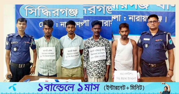 গ্রেফতারকৃতরা হলো- বরিশালের হিজলা থানাধীন চরদুর্গাপুর গ্রামের মৃত কালু চৌকিদারের ছেলে ওলিল চৌকিদার (২৬), মুন্সিগঞ্জের গজারিয়া থানাধীন জামালদী গ্রামের আমির হোসেনের ছেলে ইমরান হোসেন (২৯), সিদ্ধিরগঞ্জের সুমিলপাড়া বিহারী ক্যাম্প এলাকার আব্দুল করিমের ছেলে নাসির ওরফে কালু (৩৫) এবং একই থানাধীন গোদনাইল আরামবাগ এলাকার সুলতান ব্যাপারীর ছেলে মাসুদুর রহমান তপন (৩২)।