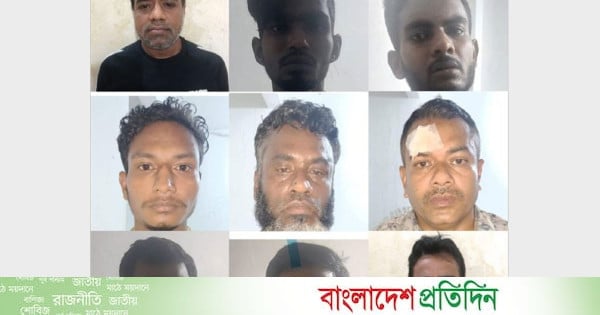 গ্রেফতাররা হলেন—মো. কামাল হোসেন (৪৪), মো. নুরে আলম (৪৫), মো. ওসমান (৩৯), মো. আব্দুর রহমান (৫৬), মো. বিল্লাল গড়ামী (৩০), মো. রনি (২৫), মো. শুভ ইসলাম কাউছার (২৪), বাপ্পী শিকদার (৩৫) এবং মনিরুজ্জামান বাপ্পী ওরফে বাপ্পী শিকদার (৩২)।