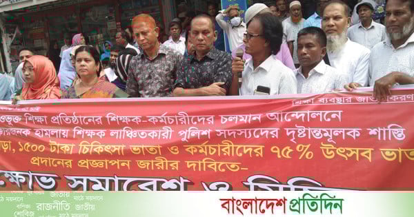 এ সময় বক্তারা বলেন, এমপিওভুক্ত শিক্ষাপ্রতিষ্ঠানের শিক্ষক-কর্মচারীরা মূল বেতনের শতকরা ২০ ভাগ ভাড়া, দেড় হাজার টাকা চিকিৎসা ভাতা ও কর্মচারীদের শতকরা ৭৫ ভাগ উৎসব ভাতা প্রদানের প্রজ্ঞাপন জারির দাবি জানিয়েছে। তারা ঢাকায় শান্তিপূর্ণ আন্দোলন কর্মসূচি পালন করলেও মানুষ গড়ার কারিগর শিক্ষকদের উপর পুলিশ হামলা করে রক্তাক্ত করেছে। যারা মানুষকে জনসম্পদে রুপান্তর করে তাদের উপর হামলা এ জাতি মেনে নেবে না। সরকার বিভিন্ন খাতে কোটি কোটি টাকা অর্থ খরচ করলেও শিক্ষাখাতের প্রতি অবহেলা করছে। অবিলম্বে শিক্ষকদের দাবি মানা না হলে কঠোর আন্দোলন গড়ে তোলা হবে।