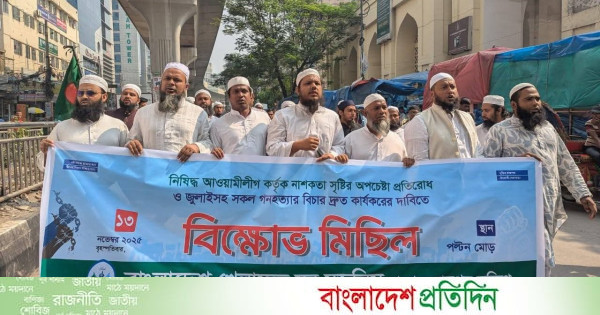 নিষিদ্ধ আওয়ামী লীগ কর্তৃক দেশজুড়ে নাশকতা সৃষ্টির অপচেষ্টা প্রতিরোধ এবং জুলাইসহ অতীতের সব গণহত্যার বিচার দ্রুত কার্যকরের দাবিতে বৃহস্পতিবার বাংলাদেশ খেলাফত যুব মজলিসের উদ্যোগে দেশব্যাপী বিক্ষোভ মিছিল ও প্রতিবাদ সমাবেশ অনুষ্ঠিত হয়েছে।