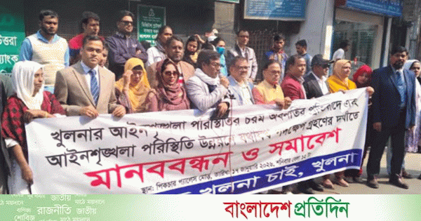 খুলনার আইনশৃঙ্খলার পরিস্থিতি উন্নয়নে পদক্ষেপ গ্রহণের দাবিতে নাগরিক সংগঠন ‘নিরাপদ খুলনা চাই’-এর উদ্যোগে মানববন্ধন ও সমাবেশ অনুষ্ঠিত হয়েছে।