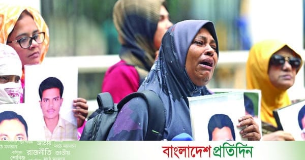 হাতে প্রিয়জনের ছবি, চোখে অশ্রু। একটাই দাবি, ‘বিচার চাই, খোঁজ চাই’। দুপুরের প্রচণ্ড রোদ উপেক্ষা করে গুম ও বিচারবহির্ভূত হত্যাকাণ্ডে জড়িতদের বিচারের দাবিতে মানববন্ধন করেছেন গুমের শিকার হওয়া ব্যক্তিদের পরিবারের সদস্যরা। গতকাল হাই কোর্ট প্রাঙ্গণে ‘মায়ের ডাক’ এর ব্যানারে তারা এ মানববন্ধন করেন।