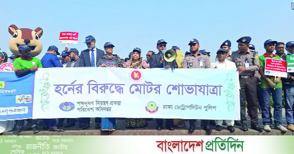 পরিবেশ অধিদপ্তরের বাস্তবায়নাধীন ‘শব্দদূষণ নিয়ন্ত্রণে সমন্বিত ও অংশীদারিত্বমূলক প্রকল্প’-এর আওতায় শব্দদূষণ নিয়ন্ত্রণে জনসচেতনতা বৃদ্ধির লক্ষ্যে পরিবেশ অধিদপ্তর এবং ঢাকা মেট্রোপলিটন পুলিশের (ডিএমপি) যৌথ উদ্যোগে ‘হর্নের বিরুদ্ধে মোটর শোভাযাত্রা’ গতকাল অনুষ্ঠিত হয়েছে। এতে উপস্থিত ছিলেন পরিবেশ উপদেষ্টা সৈয়দা রিজওয়ানা হাসান, মন্ত্রণালয়ের সচিব ড. ফারহিনা আহমেদ, অধিদপ্তরের মহাপরিচালক ড. মো. কামরুজ্জামান, ঢাকা মেট্রোপলিটন পুলিশের অতিরিক্ত পুলিশ কমিশনার (অ্যাডমিন) মো. সরওয়ার প্রমুখ।