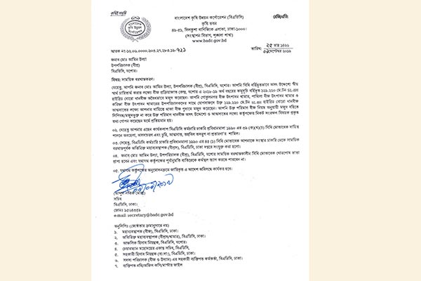 বিএডিসির সচিব আব্দুল লতিফ মোল্লা সোমবার বিকালে এক চিঠিতে এ আদেশ দেন। বিএডিসির ওয়েবসাইট থেকে এ তথ্য জানা গেছে।