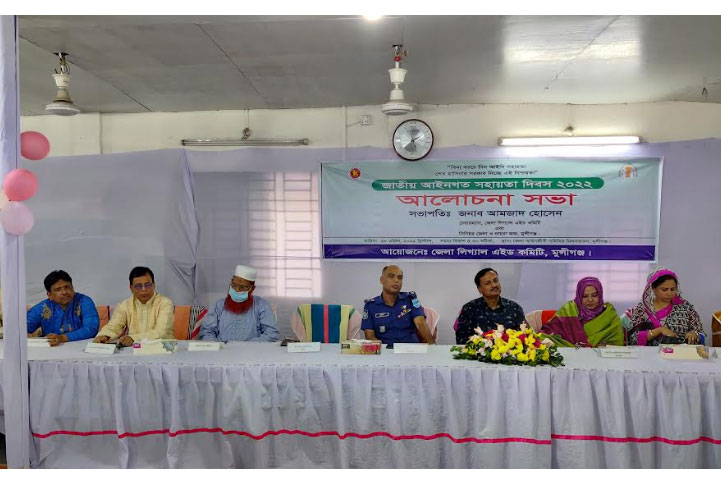 "বিনা খরচে নিন আইনি সহায়তা শেখ হাসিনার সরকার দিচ্ছে এই নিশ্চয়তা" এই শ্লোগানকে সামনে নিয়ে মুন্সীগঞ্জে পালিত হলো জাতীয় আইনগত সহায়তা দিবস। বৃহস্পতিবার বিকেল সাড়ে ৪টার দিকে জেলা আইনজীবী সমিতির অডিটোরিয়ামে এক আলোচনা সভা অনুষ্ঠিত হয়। এতে সভাপতিত্ব করেন জেলা লিগাল এইট কমিটির চেয়ারম্যান ও সিনিয়র জেলা ও দায়রা জজ মোঃ আমজাদ হোসেন।