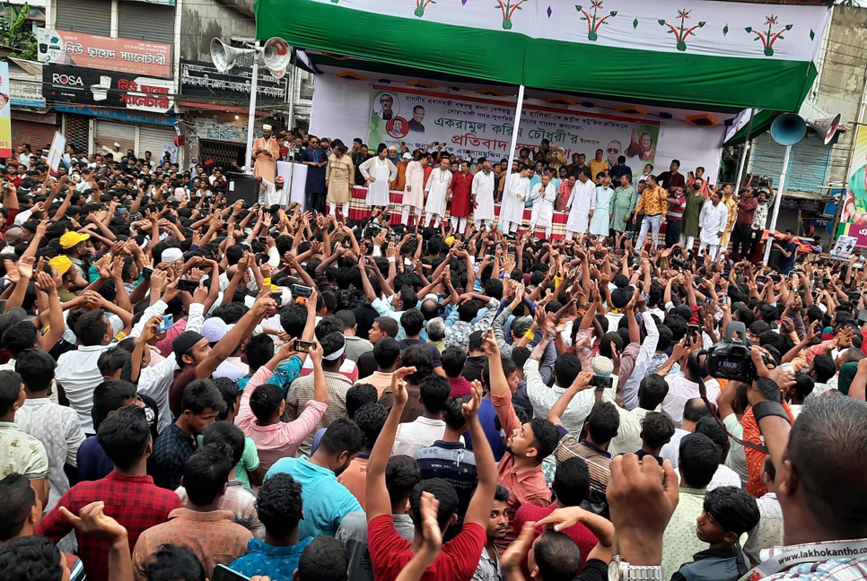 প্রধানমন্ত্রী শেখ হাসিনাকে নিয়ে বিএনপির বিভিন্ন কটূক্তির প্রতিবাদে নোয়াখালী-৪ (সদর-সূবর্ণচর) আসনের এমপি একরামুল করিম চৌধুরীর উদ্যোগে শনিবার বিকালে প্রতিবাদ সমাবেশ জনসমুদ্রে পরিণত হয়েছে।