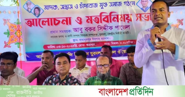 ব্রাহ্মণবাড়িয়ার বাঞ্ছারামপুর উপজেলার বাহাদুরপুরে সন্ত্রাস ও চাঁদাবাজ মুক্ত সমাজ গঠনে এক আলোচনা ও মতবিনিময় সভা অনুষ্ঠিত হয়েছে। শুক্রবার বাহাদুরপুর ঈদগাহ ময়দানে এ সভা অনুষ্ঠিত হয়। বাহাদুরপুর গ্রামের মোরসেন মিয়ার সভাপতিত্বে অনুষ্ঠানে প্রধান অতিথি ছিলেন যুবদল কেন্দ্রীয় নির্বাহী কমিটির সাবেক মৎস্য ও প্রাণী সম্পদ বিষয়ক সম্পাদক আবু বকর সিদ্দীক পাভেল।