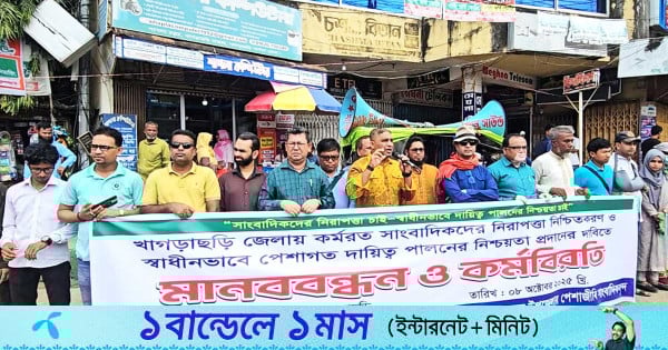 ‘সাংবাদিকদের নিরাপত্তা চাই–স্বাধীনভাবে দায়িত্ব পালনের নিশ্চয়তা চাই’- এই স্লোগানে খাগড়াছড়িতে কর্মরত সাংবাদিকরা মানববন্ধন ও কর্মবিরতি কর্মসূচি পালন করেছেন। পেশাগত নিরাপত্তা ও স্বাধীনভাবে দায়িত্ব পালনের নিশ্চয়তা দাবি করে বুধবার (৮ অক্টোবর) সকালে খাগড়াছড়ি শহরের শাপলা চত্বরে এই কর্মসূচি অনুষ্ঠিত হয়।