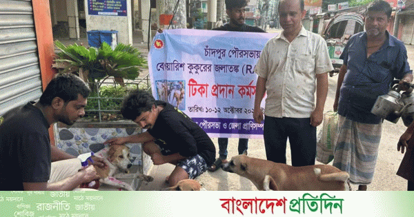 জননিরাপত্তা ও জনস্বাস্থ্যের স্বার্থে চাঁদপুর পৌরসভায় পথ কুকুরকে জলাতঙ্ক টিকা প্রয়োগ করা হচ্ছে। সোমবার (১৩ অক্টোবর) সকালে পৌর কর্তৃপক্ষ এবং জেলা প্রাণিসম্পদ দফতরের যৌথ উদ্যোগে শহরের বিভিন্ন পাড়া-মহল্লায় বেওয়ারিশ পথকুকুরকে জলাতঙ্ক টিকা দেয়ার কর্মসূচি হাতে নেওয়া হয়েছে।
