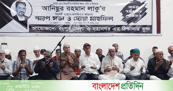 রংপুর জেলা বিএনপির সদস্য সচিব ও বিশিষ্ট ঠিকাদার আনিছুর রহমান লাকুর স্মরণে শোকসভা ও দোয়া মাহফিল অনুষ্ঠিত হয়েছে। সোমবার রাতে জেলা পরিষদ কমিউনিটি সেন্টার মিলনায়তনে জেলা ও মহানগর ঠিকাদার সমিতির উদ্যোগে এই অনুষ্ঠান আয়োজন করা হয়।