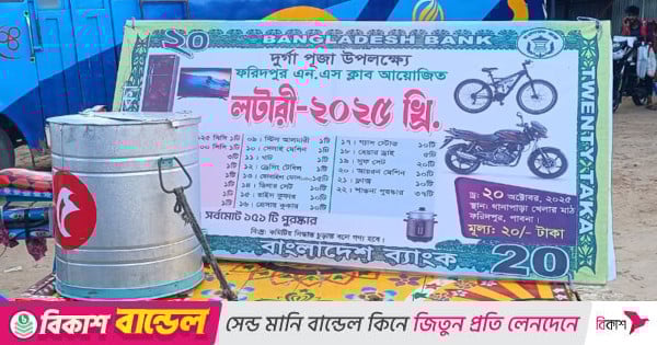 দুর্গাপূজা উপলক্ষে পাবনার ফরিদপুর উপজেলার থানাপাড়া খেলার মাঠে এনএস ক্লাবের আয়োজনে লটারি-২০২৫ নামে একটি লটারির আয়োজন করা হয়েছে। প্রশাসনের অনুমোদন ছাড়াই লটারি পরিচালিত হচ্ছে, যা লটারি আইন ২০১২-এর ধারা ৫ ও ৬ অনুযায়ী স্পষ্টতই অবৈধ।