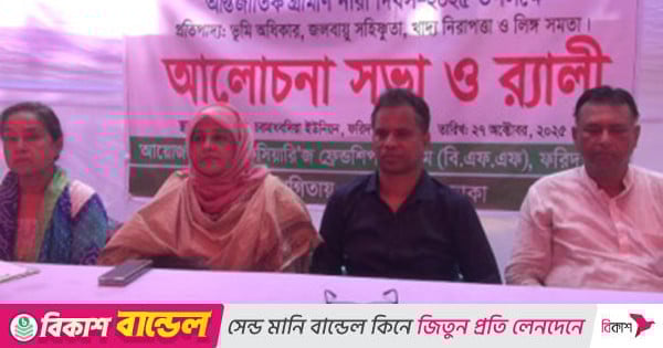 র্যালিটি গ্রামের বিভিন্ন সড়ক প্রদক্ষিন করে। পরে এক আলোচনা সভার আয়োজন করা হয়। ভূমি অধিকার, জলবায়ু সহিঞ্চুতা, খাদ্য নিরাপত্তা ও লিঙ্গ সমতা এ প্রতিপাদ্যকে সামনে রেখে আলোচনা সভায় প্রধান অতিথি হিসাবে উপস্থিত ছিলেন জেলা মহিলা বিষয়ক অধিদপ্তরের উপপরিচালক মাসউদা হোসেন। বিএফএফের নির্বাহী পরিচালক আ.ন.ম ফজলুল হাদি সাব্বিরের সভাপতিত্বে আলোচনায় অংশ নেন রাসিনের নির্বাহী পরিচালক আসমা আক্তার মুক্তা, পিডাব্লিউও’র পরিচালক মোঃ হাফিজুর রহমান, ফরিদপুর প্রেসক্লাবের সাবেক সাধারণ সম্পাদক কামরুজ্জামান সোহেল, বাকিগঞ্জ ইসলামিয়া মাদ্রাসার শিক্ষক হাসানুর রহমান রিয়াদ,বিএফএফএ’র কোষাধ্যক্ষ জাকিয়া খানম, উপ সহকারী কৃষি কর্মকর্তা সাহানা ইয়াসমিন, বিএফএফ’র মানবসম্পদ ও প্রশাসনিক কর্মকর্তা রুম্মানা ফেরদৌসি, কর্মসূচি সংগঠক পারমিতা বিশ্বাস প্রমুখ। অনুষ্ঠানটি সঞ্চালনা করেন বিএফএফএ’র হিসাব কর্মকর্তা আশরাফুন্নাহার।