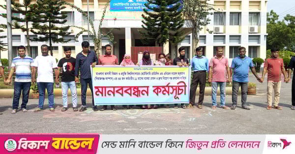 মাওলানা ভাসানী বিজ্ঞান ও প্রযুক্তি বিশ্ববিদ্যালয়ের (মাভাবিপ্রবি) ভেটেরিনারি মেডিসিন অ্যান্ড অ্যানিমেল সায়েন্স অনুষদের সিরাজগঞ্জ ক্যাম্পাসে কর্মরত রাজস্ব খাতের সৃজনকৃত আউটসোর্সিং প্রকল্পের ৩৪ জন কর্মচারী গত ১১ মাস ধরে বেতন না পেয়ে চরম মানবেতর জীবনযাপন করছেন। এ অবস্থায় তারা বুধবার (২৯ অক্টোবর) সকালে সিরাজগঞ্জের বেলকুচি ক্যাম্পাস চত্বরে মানববন্ধন কর্মসূচি পালন করেন। মানববন্ধনে কর্মচারীরা দ্রুত বকেয়া বেতন পরিশোধ ও স্থায়ী নিয়োগের দাবি জানান।