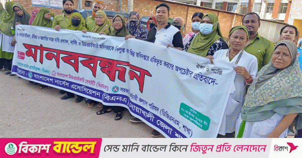বৃহস্পতিবার দুপুরে নোয়াখালী জেনারেল হাসপাতালের সামনে এ মানববন্ধনের আয়োজন করে বাংলাদেশ নার্সেস অ্যাসোসিয়েশন, নোয়াখালী জেলা শাখা।