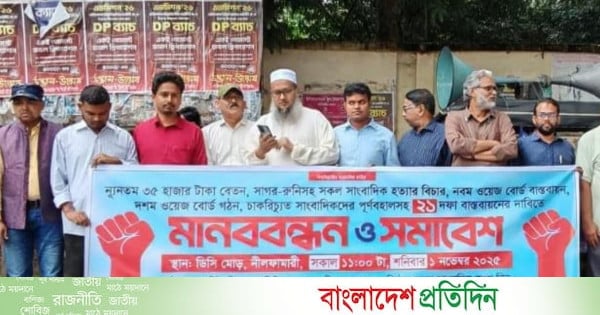শনিবার বেলা এগারটার দিকে জেলা শহরের ডিসি চত্বরে এই মানববন্ধন কর্মসূচি অনুষ্ঠিত হয়। দাবিগুলোর মধ্যে আরও আছে ন্যূনতম ৩৫ হাজার টাকা বেতন, সাগর-রুনিসহ সকল সাংবাদিক হত্যার বিচার ও দশম ওয়েজ বোর্ড গঠন।