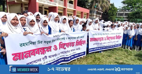 কুমিল্লার লাকসামের শতবর্ষী বিজরা রহমানিয়া চিরসবুজ উচ্চ বিদ্যালয় ও কলেজের জমি দখলের চেষ্টার প্রতিবাদে শিক্ষার্থী, শিক্ষক ও এলাকাবাসী মানববন্ধন ও বিক্ষোভ মিছিল করেছে।