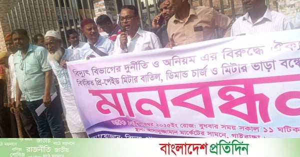 প্রিপেইড মিটার সংযোগের সিদ্ধান্ত বাতিলের দাবিতে গাইবান্ধায় মানববন্ধন অনুষ্ঠিত হয়েছে। বুধবার (১২ নভেম্বর) দুপুরে শহরের ডিবি রোড গানাসার্স মার্কেটের সামনে বিদ্যুৎ গ্রাহক ও সেচ পাম্প মালিক সমিতি জেলা শাখার আয়োজনে এ মানববন্ধন অনুষ্ঠিত হয়।