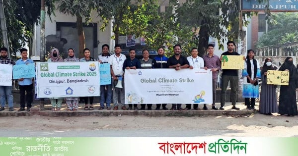 দিনাজপুরে জলবায়ু পরিবর্তন মোকাবিলায় জরুরি পদক্ষেপ নেওয়ার দাবিতে 'গ্লোবাল ক্লাইমেট স্ট্রাইক' অনুষ্ঠিত হয়েছে। শুক্রবার দিনাজপুর প্রেসক্লাবের সামনে মানববন্ধনের মাধ্যমে অর্ধশতাধিক তরুণ জলবায়ুকর্মী জলবায়ু ন্যায়বিচার ও ন্যায্য রূপান্তরের দাবি তুলে ধরেন।