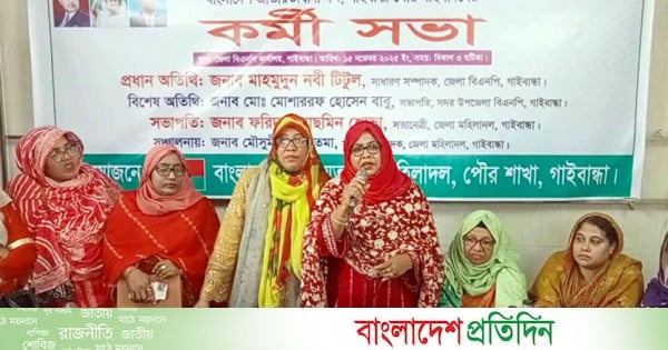 ‘চেতনায় নারী, বিপ্লবে নারী-গণতন্ত্র ফেরাতে আমরাই পারি’ এ স্লোগান নিয়ে জাতীয়তাবাদী মহিলা দলের কর্মীসভা গাইবান্ধায় অনুষ্ঠিত হয়েছে। শনিবার দুপুরে জেলা কার্যালয়ে গাইবান্ধা পৌর মহিলা দল এ কর্মসূচির আয়োজন করে। এতে প্রধান অতিথি ছিলেন জেলা বিএনপির সাধারণ সম্পাদক মাহামুদুন নবী টিটুল।