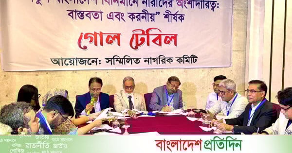 ‘নতুন বাংলাদেশ বিনির্মাণে নারীদের অংশীদারিত্ব : বাস্তবতা ও করণীয়’ শীর্ষক গোলটেবিল আলোচনা অনুষ্ঠিত হয়েছে। রবিবার (১৬ নভেম্বর) বেলা ১১টায় রাজশাহীর একটি হোটেলে সম্মিলিত নাগরিক কমিটির উদ্যোগে এ গোলটেবিল অনুষ্ঠিত হয়। অনুষ্ঠানে প্রধান অতিথি হিসেবে উপস্থিত ছিলেন বিএনপির মিডিয়া সেলের আহ্বায়ক অধ্যাপক মওদুদ হোসেন আলমগীর পাভেল।