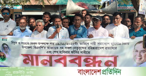 জাতীয় বিপ্লব ও সংহতি দিবসে ময়মনসিংহের গৌরীপুরে নারী সমাবেশে হামলার বিচার ও উপজেলা বিএনপির আহ্বায়ক (বহিষ্কৃত) আহাম্মদ তায়েবুর রহমান হিরণ সহ ২৪ নেতার বহিষ্কারাদেশ প্রত্যাহার এবং ক্ষমতাচ্যুত প্রধানমন্ত্রী ফ্যাসিস্ট শেখ হাসিনার ফাঁসির দাবিতে মানববন্ধন পালিত হয়েছে।