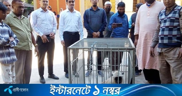 বুধবার হনুমানটিকে উদ্ধার করে খাঁচায় বন্দি করা হয়েছে। একে দেখতে ভিড় করছেন উৎসুক লোকজন।