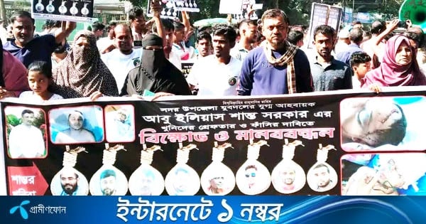 মানববন্ধনে বক্তারা বলেন, ‘সদর উপজেলা যুবদলের যুগ্ম আহ্বায়ক আবু ইলিয়াস শান্তকে পরিকল্পিতভাবে হত্যা করা হয়েছে। অথচ মামলার আসামিরা প্রকাশ্যে ঘুরে বেড়াচ্ছে। ২৪ ঘণ্টার মধ্যে মামলার প্রধান আসামি টিপু মোল্লা ও নৌ–ডাকাত কিবরিয়া মিজিসহ এজাহারনামীয় সকল আসামিকে গ্রেপ্তার করে সর্বোচ্চ শাস্তি নিশ্চিত করতে হবে।’