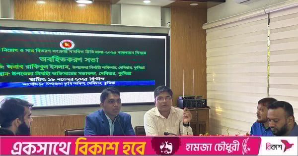 ‘সার ডিলার নিয়োগ ও সার বিতরণ-সংক্রান্ত সমন্বিত নীতিমালা- ২০২৫’-এর বিষয়ে অবহিতকরণ সভা দেবিদ্বার উপজেলার উপজেলা নির্বাহী কর্মকর্তার (ইউএনও) কনফারেন্স রুমে অনুষ্ঠিত হয়েছে। উপজেলা সার ও বীজ মনিটরিং কমিটির সদস্যসচিব ও উপজেলা কৃষি কর্মকর্তা কৃষিবিদ বানিন রায়ের সঞ্চালনায় উক্ত অবহিতকরণ সভায় সভাপতিত্ব করেন উপজেলা সার ও বীজ মনিটরিং কমিটির সভাপতি ও উপজেলা নির্বাহী কর্মকর্তা রাকিবুল ইসলাম।