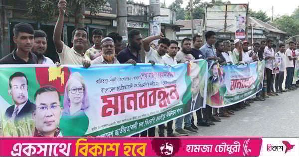 একই সময় হালিমপুর মঈতপুর ব্রিজ থেকে নিকলী বেরিবাঁধ পর্যন্ত নিকলী উপজেলা বিএনপি ও এর অঙ্গসংগঠনের নেতাকর্মীরা মানববন্ধন করেছে।