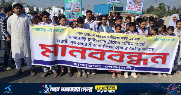 মানববন্ধনে এলাকাবাসী, স্কুল শিক্ষার্থী এবং বিভিন্ন পোশাক কারখানার শ্রমিকরা অংশগ্রহণ করেন।