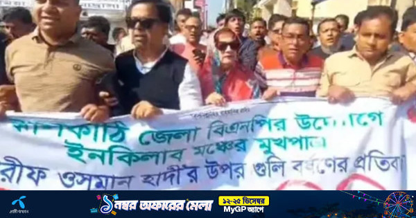 ইনকিলাব মঞ্চের আহ্বায়ক ওসমান হাদি ঢাকায় গুলিবিদ্ধ হওয়ার ঘটনার প্রতিবাদে ঝালকাঠিতে বিক্ষোভ ও সমাবেশ করেছে জেলা বিএনপি।