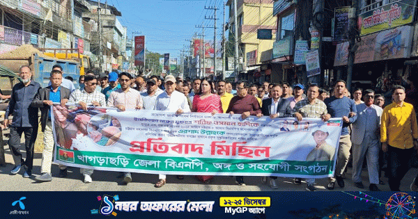 শনিবার দুপুরে খাগড়াছড়ি জেলা বিএনপির কার্যালয় থেকে জেলা বিএনপি, অঙ্গ ও সহযোগী সংগঠনের ব্যানারে একটি প্রতিবাদ মিছিল বের করা হয়। মিছিলটি শহরের গুরুত্বপূর্ণ সড়ক প্রদক্ষিণ করে মুক্তমঞ্চে গিয়ে শেষ হয়। সেখানে অনুষ্ঠিত হয় প্রতিবাদ সমাবেশ।