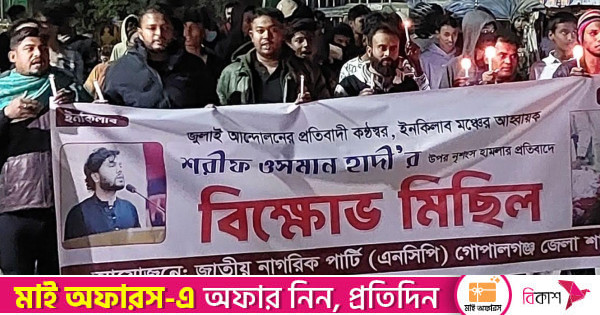 জাতীয় সংসদ নির্বাচনে ঢাকা-৮ আসনের স্বতন্ত্র প্রার্থী ও ইনকিলাব মঞ্চের মুখপাত্র শরিফ ওসমান হাদির ওপর হামলার প্রতিবাদে গোপালগঞ্জে বিক্ষোভ মিছিল করেছে জাতীয় নাগরিক পার্টির (এনসিপি) নেতাকর্মীরা।