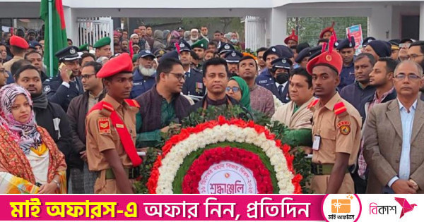 প্রথমে জেলা প্রশাসক আবু সাঈদ পুষ্পমাল্য অর্পণ করেন। পরে পুলিশ সুপার মোহাম্মদ মনজুর আহমেদ সিদ্দিকীসহ বিভিন্ন রাজনৈতিক, সামাজিক ও সাংস্কৃতিক সংগঠন শ্রদ্ধা নিবেদন করে।