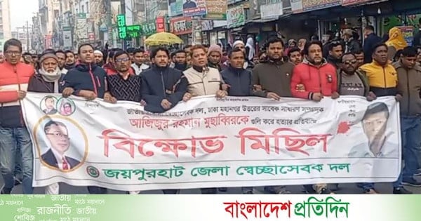 ঢাকা মহানগর উত্তর স্বেচ্ছাসেবক দলের সাবেক সাধারণ সম্পাদক আজিজুর রহমান মোসাব্বিরকে গুলি করে হত্যার প্রতিবাদে জয়পুরহাটে বিক্ষোভ মিছিল করেছে জেলা স্বেচ্ছাসেবক দল।