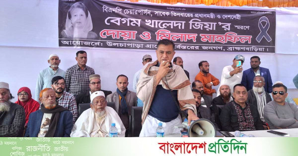 বিএনপির চেয়ারর্পাসন ও সাবেক প্রধানমন্ত্রী প্রয়াত বেগম খালেদা জিয়ার রূহের মাগফিরাত কামনায় মঙ্গলবার (১৩ জানুয়ারি) ব্রাহ্মণবাড়িয়ায় বিএনপির উদ্যোগে দোয়া মাহফিল অনুষ্ঠিত হয়েছে।