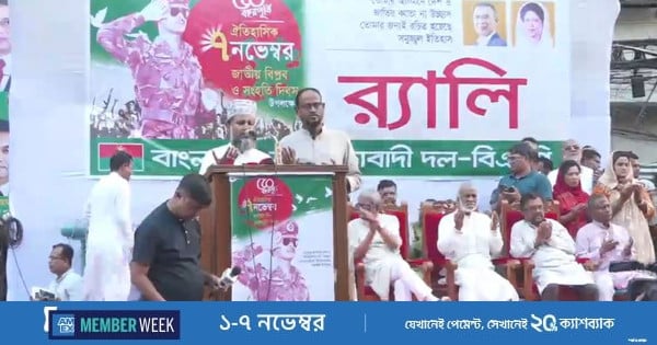 ঐতিহাসিক ৭ নভেম্বর ‘জাতীয় বিপ্লব ও সংহতি দিবস’-এর সুবর্ণজয়ন্তী উপলক্ষে রাজধানীতে বর্ণাঢ্য র‌্যালি করছে বিএনপি। র‌্যালি ঘিরে শুক্রবার দুপুর থেকেই নয়াপল্টনে ঢল নামে বিএনপির নেতা-কর্মীদের।
