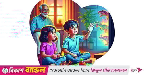 নানাভাই চুপ করে সেদিকে তাকিয়ে আছেন। মায়রন খেলছে ডাইনোসরের সঙ্গে।