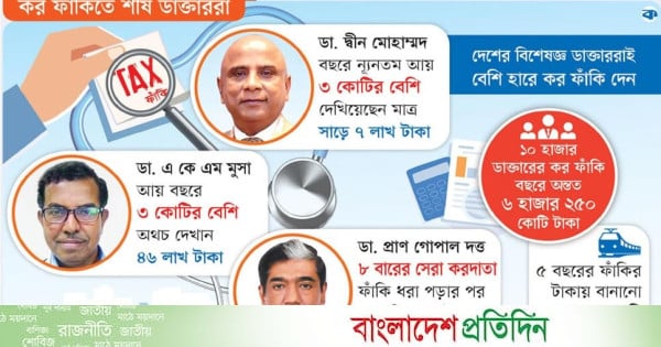 কর বিভাগের কাছে ধরা পড়ার পর কেউ কেউ জরিমানাসহ ফাঁকির টাকা জমা দিচ্ছেন। কিন্তু বেশির ভাগই ধরাছোঁয়ার বাইরে। অনুসন্ধানে দেখা গেছে, দেশে অন্তত ১০ হাজার ডাক্তার রয়েছেন, যাঁরা বেশি আয় করেও বছরে অন্তত ছয় হাজার ২৫০ কোটি টাকার কর ফাঁকি দেন।