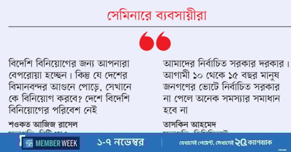 বাংলাদেশ টেক্সটাইল মিলস অ্যাসোসিয়েশনের সভাপতি শওকত আজিজ রাসেল বলেন, ‘বিদেশি বিনিয়োগের জন্য আপনারা বেপরোয়া (ডেসপারেট) হচ্ছেন। কিন্তু যে দেশের বিমানবন্দর আগুনে পুড়ে, সেখানে কে বিনিয়োগ করবে? দেশে বিদেশি বিনিয়োগের পরিবেশ নেই।’