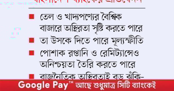 বাংলাদেশ ব্যাংকের ওই প্রতিবেদনে বোঝানো হয়েছে, এসব ভূ-রাজনৈতিক ঝুঁকি তেল ও খাদ্যপণ্যের বৈশ্বিক বাজারে অস্থিরতা সৃষ্টি করতে পারে, যা মূল্যস্ফীতি আবারও ঊর্ধ্বমুখী করতে পারে। একই সঙ্গে বৈদেশিক বাজারে তৈরি পোশাক রপ্তানির অর্ডার এবং রেমিট্যান্সপ্রবাহেও অনিশ্চয়তা তৈরি হতে পারে।