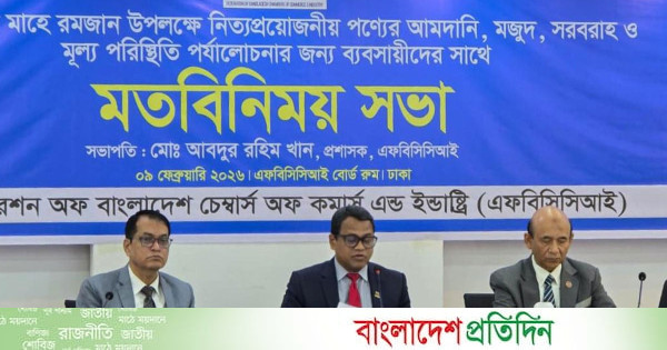 আসন্ন রমজান উপলক্ষে নিত্য-প্রয়োজনীয় পণ্যের আমদানি, মজুদ, সরবরাহ ও মূল্য পরিস্থিতি পর্যালোচনার লক্ষ্যে সংশ্লিষ্ট ব্যবসায়ী ও অংশীজনদের সঙ্গে মতবিনিময় সভা করেছে দি ফেডারেশন অব বাংলাদেশ চেম্বার্স অব কমার্স অ্যান্ড ইন্ডাস্ট্রি (এফবিসিসিআই)।
