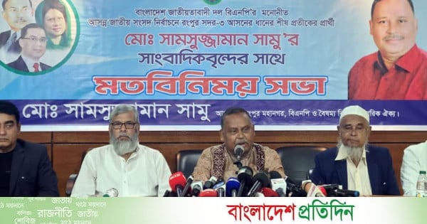 রংপুর-৩ সদর আসনের বিএনপি মনোনিত প্রার্থী সামসুজ্জামান সামু। রবিবার দুপুরে চেম্বার ভবন মিলনায়তনে সাংবাদিকদের সঙ্গে মতবিনিময় করেছেন।