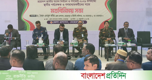 ত্রয়োদশ জাতীয় সংসদ নির্বাচন ও গণভোটকে সামনে রেখে মেহেরপুরে স্থানীয় পর্যবেক্ষক ও গণমাধ্যম কর্মীদের সঙ্গে এক মতবিনিময় সভা অনুষ্ঠিত হয়েছে। বুধবার সকাল সাড়ে ১১টার দিকে জেলা প্রশাসক কার্যালয়ের ছাদ বাগানে এ সভা অনুষ্ঠিত হয়।