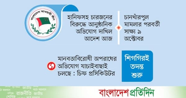 মানবতাবিরোধী অপরাধের মামলায় আওয়ামী লীগের যুগ্ম সাধারণ সম্পাদক মাহবুব উল আলম হানিফসহ চার আসামির বিরুদ্ধে আনুষ্ঠানিক অভিযোগ (ফরমাল চার্জ) দাখিল করা হয়েছে। গতকাল আন্তর্জাতিক অপরাধ ট্রাইব্যুনাল-২-এ আনুষ্ঠানিক অভিযোগ দাখিল করে প্রসিকিউশন। পরে অভিযোগ আমলে নেওয়ার বিষয়ে আদেশের জন্য আজকের দিন ধার্য করেন ট্রাইব্যুনাল।