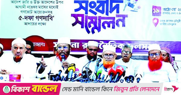 গতকাল জাতীয় প্রেস ক্লাবে আয়োজিত ৮টি দলের যৌথ সংবাদ সম্মেলন থেকে তিন দিনের এ কর্মসূচি ঘোষণা করা হয়। দলগুলো হলো- বাংলাদেশ জামায়াতে ইসলামী, ইসলামী আন্দোলন বাংলাদেশ, খেলাফত মজলিস, বাংলাদেশ খেলাফত মজলিস, বাংলাদেশ নেজামে ইসলাম পার্টি, বাংলাদেশ খেলাফত আন্দোলন, জাতীয় গণতান্ত্রিক পার্টি ও বাংলাদেশ ডেভেলপমেন্ট পার্টি। সম্মেলনে লিখিত বক্তব্য পাঠ করেন খেলাফত মজলিসের মহাসচিব ড. আহমেদ আবদুল কাদের। এ সময় আগামী ২৭ অক্টোবরের মধ্যে দাবি না মানলে দেশব্যাপী বৃহত্তর আন্দোলনের ডাক দেওয়া হবে বলেও হুঁশিয়ারি দেওয়া হয়। সংবাদ সম্মেলনে উপস্থিত ছিলেন বাংলাদেশ জামায়াতে ইসলামীর সেক্রেটারি জেনারেল অধ্যাপক মিয়া গোলাম পরওয়ার, ইসলামী আন্দোলন বাংলাদেশের মহাসচিব অধ্যক্ষ ইউনুছ আলী, খেলাফত মজলিসের মহাসচিব ড. আহমেদ আবদুল কাদের, বাংলাদেশ খেলাফত মজলিসের মহাসচিব মাওলানা জালাল উদ্দিন, বাংলাদেশ নেজামে ইসলাম পার্টির মহাসচিব মাওলানা মুসা বিন ইযহার, বাংলাদেশ খেলাফত আন্দোলনের নায়েবে আমির মাওলানা মুজিবুর রহমান হামিদী, জাতীয় গণতান্ত্রিক পার্টির সহসভাপতি ও মুখপাত্র ইঞ্জিনিয়ার রাশেদ প্রধান ও বাংলাদেশ ডেভেলপমেন্ট পার্টির মহাসচিব নিজামুল হক নাঈমসহ দলগুলোর বিভিন্ন পর্যায়ের নেতারা। সম্মেলনে উত্থাপিত পাঁচ দফা দাবি হলো- জুলাই জাতীয় সনদ বাস্তবায়ন আদেশ জারি ও ওই আদেশের ওপর আগামী নভেম্বরের মধ্যেই গণভোট আয়োজন। আগামী জাতীয় সংসদ নির্বাচনে উভয় কক্ষে পিআর পদ্ধতি চালু। অবাধ, সুষ্ঠু ও গ্রহণযোগ্য নির্বাচনের লক্ষ্যে সবার জন্য লেভেল প্লেয়িং ফিল্ড নিশ্চিত করা। ফ্যাসিস্ট সরকারের সব জুলুম-নির্যাতন, গণহত্যা ও দুর্নীতির বিচার দৃশ্যমান করা। স্বৈরাচারের দোসর জাতীয় পার্টি ও ১৪ দলের কার্যক্রম নিষিদ্ধ করা।